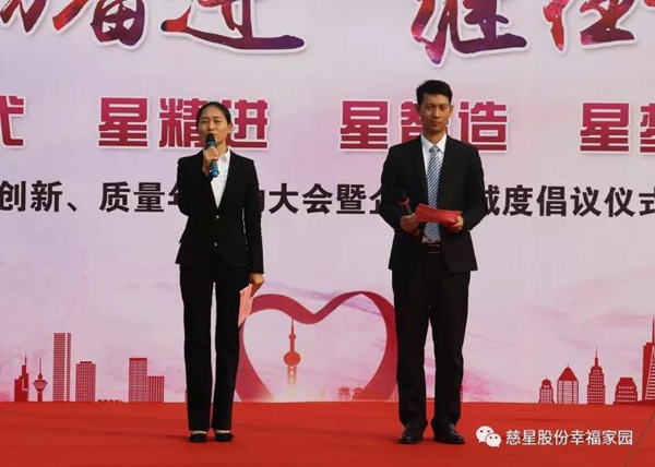 今天,我们在这里隆重举行慈星股份2018创新质量年启动大会暨企业忠诚度倡议仪式,这个活动是公司在加快企业战略实施推进步伐过程中一次非常重要的活动,我希望通过今天的活动,能够让全体家人积极行动起来,站在企业发展全局的高度,以对企业强烈的责任感和使命感,从自身做起,切实有效地做好创新质量工作,提升产品品质,增强产品市场竞争力,继续保持和巩固企业在行业的领头地位,从而推动企业健康可持续的发展。