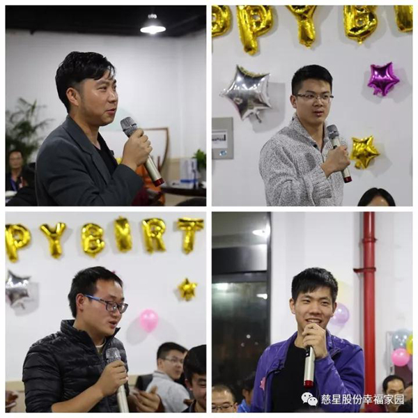 【概要描述】一份祝福, 一份真诚, 在您这个特别的日子里, 公司全体同仁给您送上生日最真挚的祝福, 祝您生日快乐、家庭幸福! 慈星每一点进步,都源于您的共同参与, 慈星每一点改善,都源于您的共同努力, 慈星每一次创新,都源于您的共同思索, 再次祝贺11月慈星寿星家人生日快乐! 结束一天的工作,寿星家人集聚生日会活动现场。 公司早已准备好丰盛可口的佳肴,为寿星们庆生。 崇敬孝道,感恩父母,