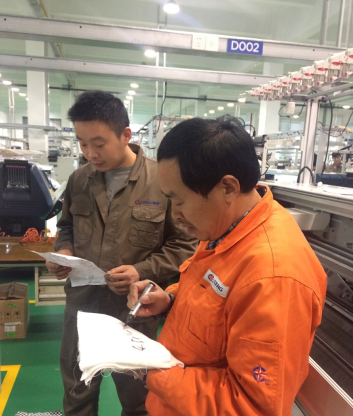 也是在一次工作沟通之余,我顺便问了一下姚师傅的主管领导封珊,一说起姚师傅,封珊马上赞不绝口。2007年姚师傅从其他岗位转到调试检验这一岗位,差不多与封珊同时期从事品质工作,一干就是十年,由于他以前一直从事手摇横机的生产管理工作,因此对横机的性能、构造等有丰富的经验,调试检验工作中看吃线、翻针位、验四平等比较有难度的工作就交给了姚师傅把关,交给姚师傅做,封珊十分放心。从事品质检验工作,难免会得罪人,难免与人产生争执,在原则问题上,姚师傅不会因为发生争执而动摇,始终坚持产品质量放第一位。科学、严谨、务实的工作作风,谦虚、谨慎、勤勉的工作态度,在姚师傅身上得到良好体现。