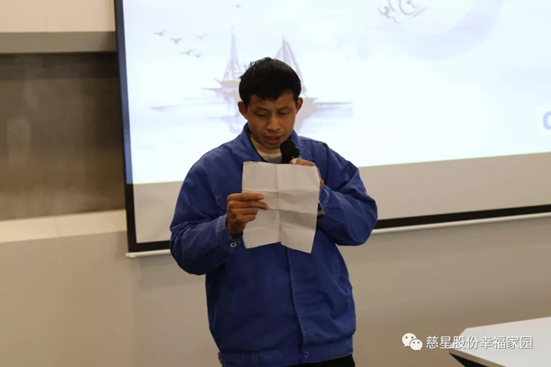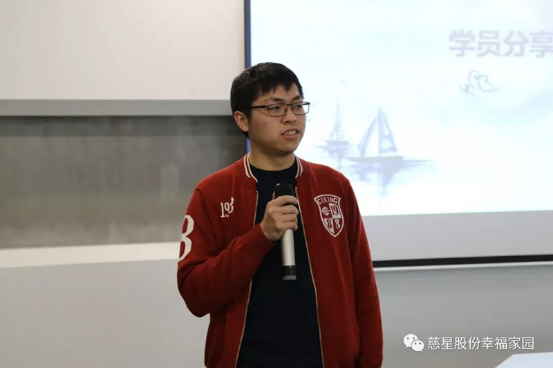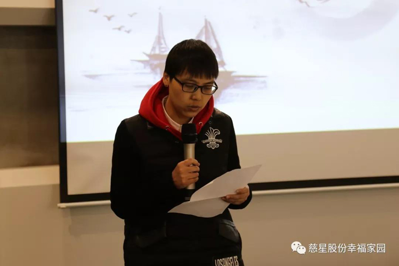 我是财务部的甘央军,我来公司已经有8年了。感谢家人们这么多年的照顾与理解,给了我这个机会参加如此有意义的培训活动。做为一个慈星人,看着公司不断的成长,我自豪,我也感恩。