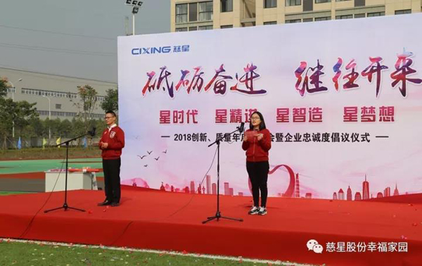 2017年11月8日上午8:30,伴着初冬温暖的阳光,全体慈星家人汇集杭州湾厂区足球场,隆重召开2018创新、质量年启动大会暨企业忠诚度倡议仪式。