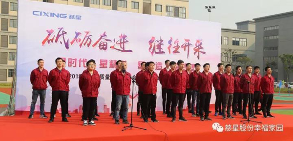 【概要描述】2017年11月8日上午8:30,伴着初冬温暖的阳光,全体慈星家人汇集杭州湾厂区足球场,隆重召开2018创新、质量年启动大会暨企业忠诚度倡议仪式。 行政人事部朱永和朱经理、企业文化部刘娟刘经理担任本次活动的主持人。 制造部合唱团的一首《慈星之歌》,唱出了慈星人的热情、豪迈、敢于担当、勇于创新的优良品质。 慈星股份董事长孙平范对此次活动做了重要讲话: 今天,我们在这里隆重举