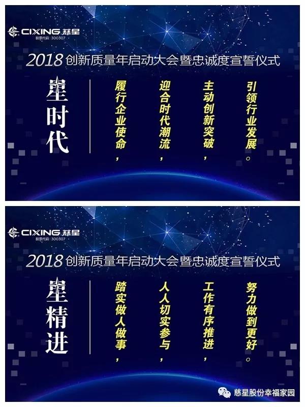 今天,我们在这里隆重举行慈星股份2018创新质量年启动大会暨企业忠诚度倡议仪式,这个活动是公司在加快企业战略实施推进步伐过程中一次非常重要的活动,我希望通过今天的活动,能够让全体家人积极行动起来,站在企业发展全局的高度,以对企业强烈的责任感和使命感,从自身做起,切实有效地做好创新质量工作,提升产品品质,增强产品市场竞争力,继续保持和巩固企业在行业的领头地位,从而推动企业健康可持续的发展。