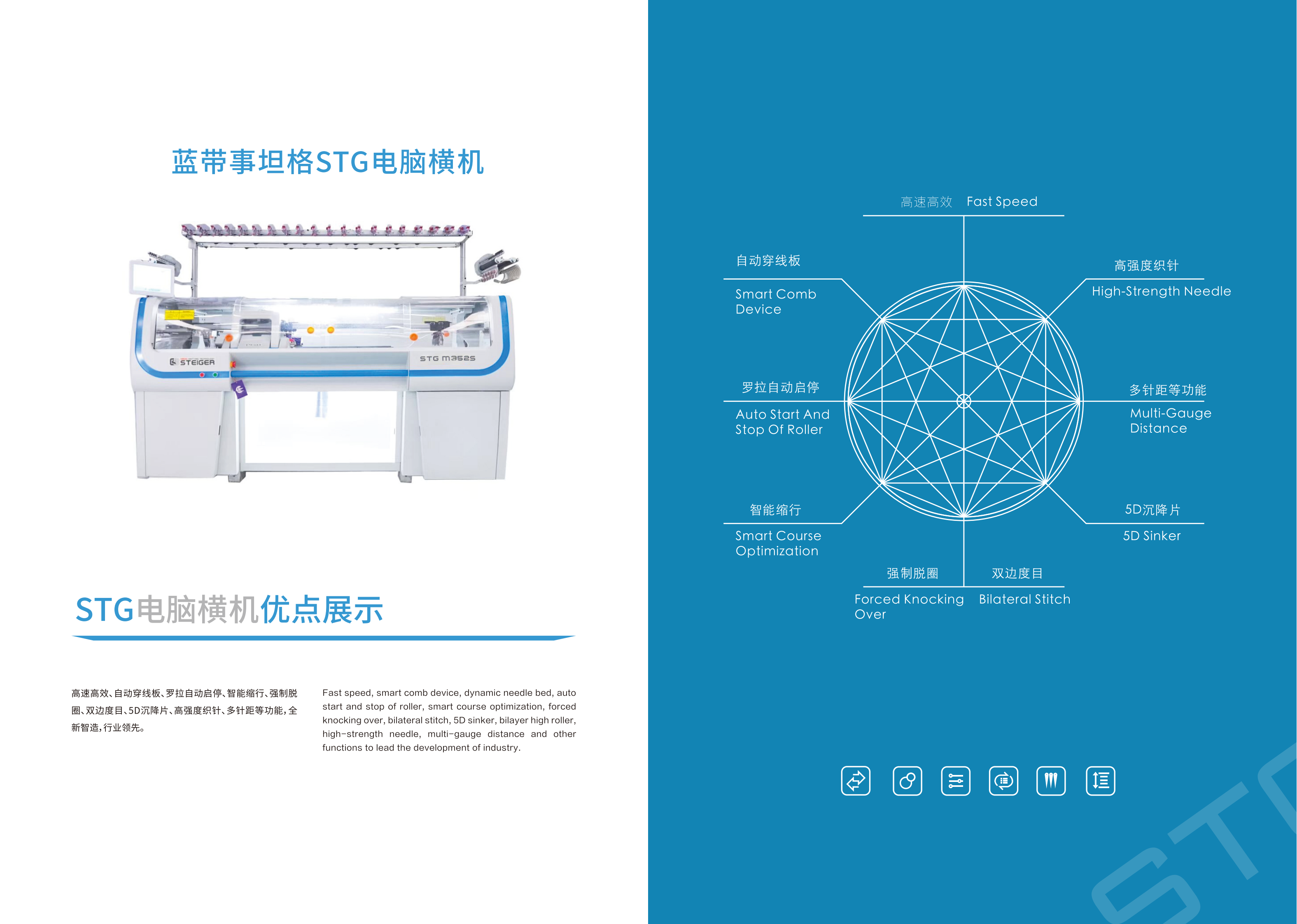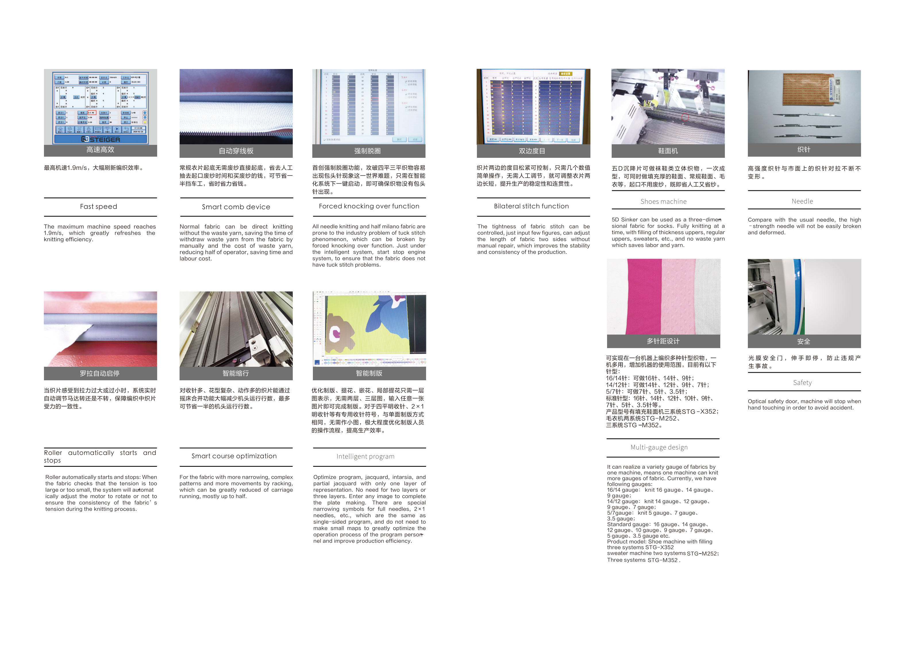 高速高效、自动穿线板、罗拉自动启停、智能缩行、强制脱 圈、双边度目、5D沉降片、高强度织针、多针距等功能,全 新智造,行业领先。