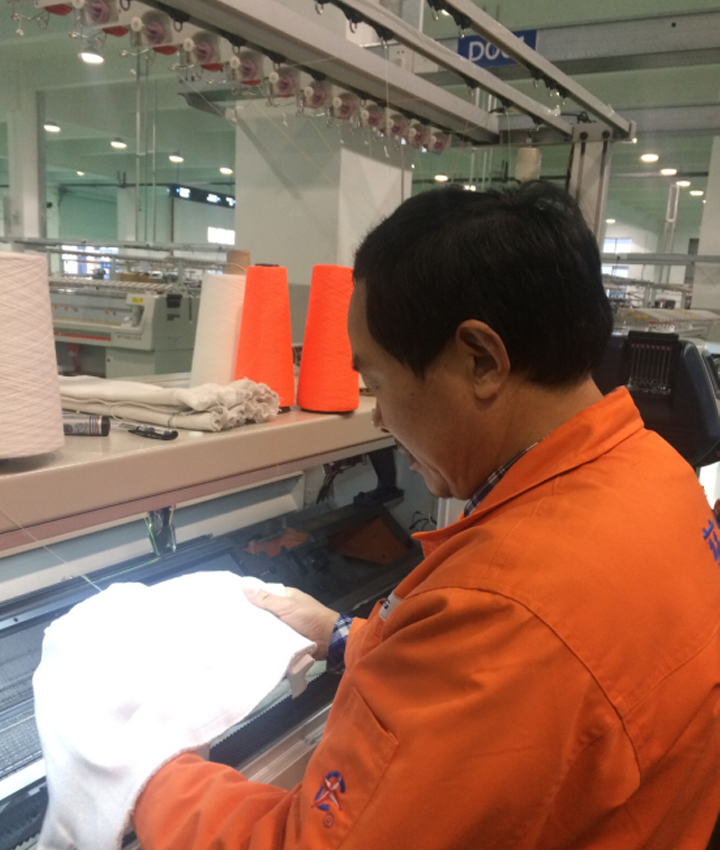 也是在一次工作沟通之余,我顺便问了一下姚师傅的主管领导封珊,一说起姚师傅,封珊马上赞不绝口。2007年姚师傅从其他岗位转到调试检验这一岗位,差不多与封珊同时期从事品质工作,一干就是十年,由于他以前一直从事手摇横机的生产管理工作,因此对横机的性能、构造等有丰富的经验,调试检验工作中看吃线、翻针位、验四平等比较有难度的工作就交给了姚师傅把关,交给姚师傅做,封珊十分放心。从事品质检验工作,难免会得罪人,难免与人产生争执,在原则问题上,姚师傅不会因为发生争执而动摇,始终坚持产品质量放第一位。科学、严谨、务实的工作作风,谦虚、谨慎、勤勉的工作态度,在姚师傅身上得到良好体现。